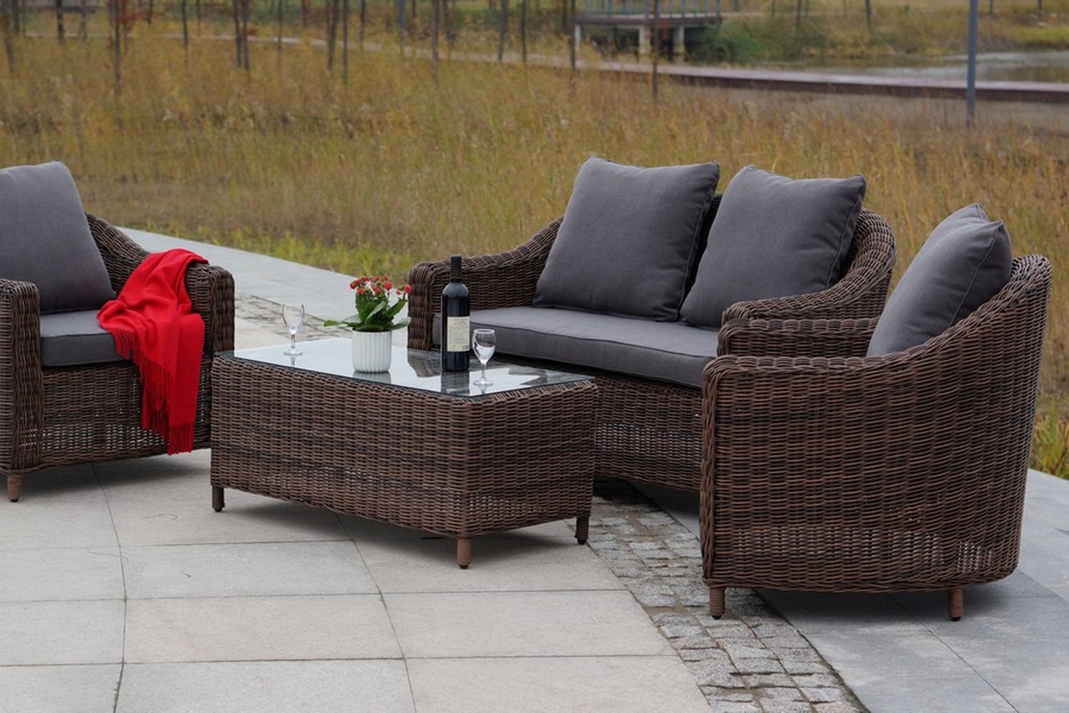 Таким садовым диваном может стать диван из коллекции Кон Панна. Диван Кон Панна – это диван размером 137х80х80 см, с коричневой оплеткой, широкими подлокотниками и закругленной спинкой.
