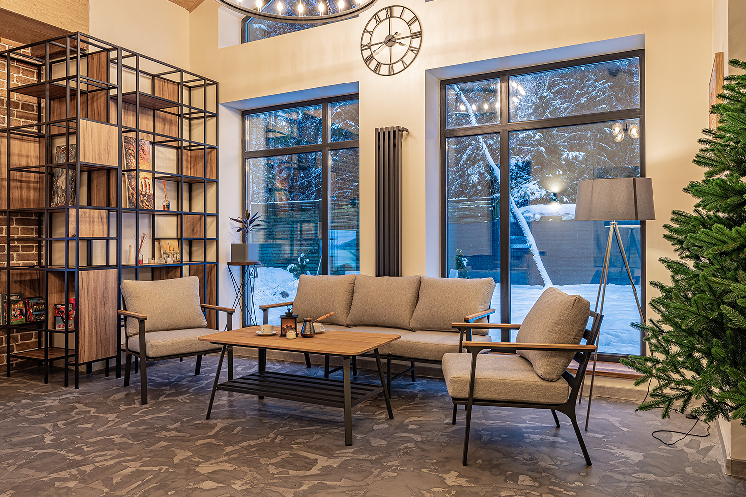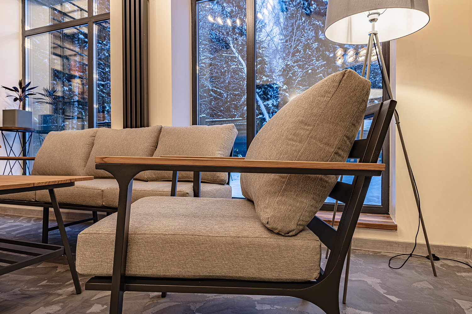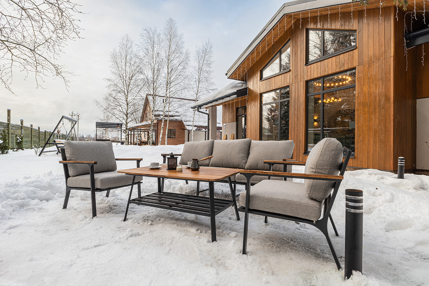 В состав комплекта садовой мебели входят: трехместный диван размером 180х77х71 см и максимальной нагрузкой 150 кг на одно место, журнальный стол размером 120х54х65 см и максимальной нагрузкой 100 кг, и два кресла размером 70,5х77х71 см с максимальной нагрузкой также 150 кг. Такой комплект идеально подойдет для установки на улице, чтобы организовать место для отдыха и приема пищи. Мебель состоит из алюминия, окрашенного в черный цвет – весь каркас, и массива тика – столешница и подлокотники.