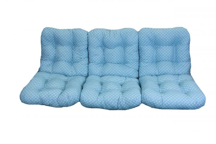 Предлагаем вам приобрести комплект синтепоновых подушек, общая длина которых составляет 180 см, в комплекте находятся три отдельные подушки, у каждой есть сидение и спинка, они скреплены друг с другом. Для того, чтобы подушки не сползали во время раскачивания есть завязки, предназначенные для фиксации. Сиденье изготовлена из бязи средней плотности, а ткань состоит на 70% из хлопка и 30% синтетики. В качестве наполнителя используется синтепон, обладающий толщиной 10 см. Для того, чтобы приобрести данную продукцию, вам просто нужно добавить в корзину необходимое количество позиций и оформить заказ.